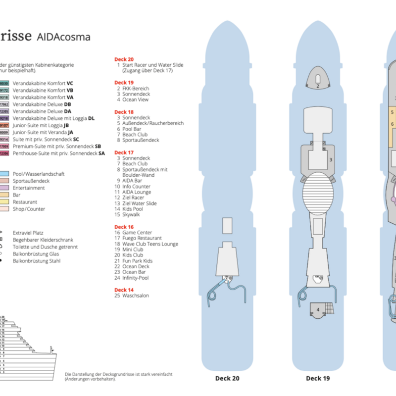 Es ist erwähnenswert, dass AIDAcosma, abgesehen von einigen unterschiedlichen Merkmalen am Heck, im Wesentlichen baugleich mit ihrer Schwester AIDAnova ist, die ebenfalls Teil der selben Klasse ist.