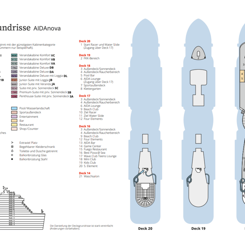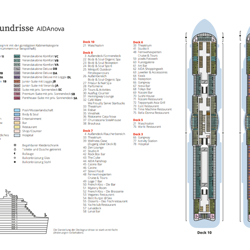 Die beeindruckenden Maße von AIDAnova sind wie folgt: Das Schiff hat eine Länge von 337 Metern, eine Breite von 42 Metern und einen Tiefgang von 8,6 Metern, was es zu einem der größten Kreuzfahrtschiffe der Welt macht. Mit einer Bruttoraumzahl von 183.858 BRZ bietet es Platz für eine Vielzahl von Passagieren und Annehmlichkeiten. Es kann bis zu 6.654 zugelassene Passagiere in insgesamt 2.626 Kabinen beherbergen und wird von ca. 1.500 Crewmitgliedern betreut, die dafür sorgen, dass die Gäste bestmöglich versorgt werden. Die Baukosten belaufen sich auf etwa 950 Millionen US-Dollar, was den hohen Standard und die Ansprüche, die an dieses luxuriöse Schiff gestellt werden, unterstreicht.