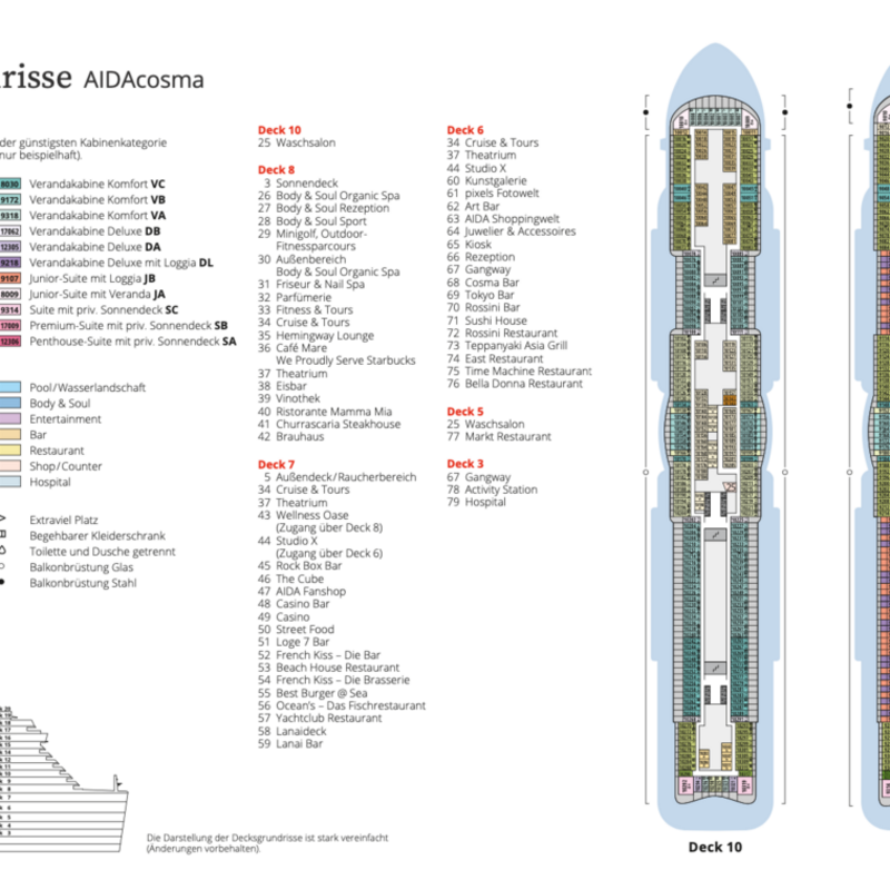 Die beeindruckenden Maße von AIDAcosma sind wie folgt: Das Schiff hat eine Länge von 337 Metern, eine Breite von 42 Metern und einen Tiefgang von 8,6 Metern, was es zu einem der größten Kreuzfahrtschiffe der Welt macht. Mit einer Bruttoraumzahl von 183.774 BRZ bietet es Platz für eine Vielzahl von Passagieren und Annehmlichkeiten. Es kann bis zu 6.600 zugelassene Passagiere in insgesamt 2.732 Kabinen beherbergen und wird von ca. 1.500 Crewmitgliedern betreut, die dafür sorgen, dass die Gäste bestmöglich versorgt werden. Die Baukosten belaufen sich auf etwa 950 Millionen US-Dollar, was den hohen Standard und die Ansprüche, die an dieses luxuriöse Schiff gestellt werden, unterstreicht.